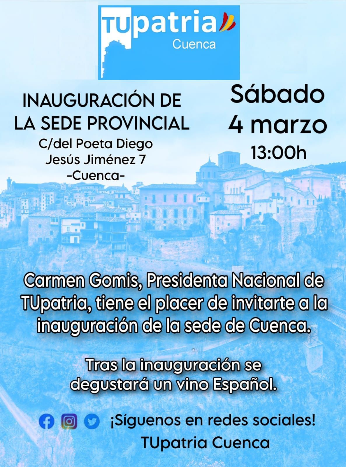 Vicepresidente D. Serafín Serrano y Secretario General D. Alberto Plaza en la presentación de la CEP de Cuenca junto a su Presidente M. Esther de la Cruz. TUpatria ha presentado este sábado 4 de noviembre una renovada Comisión Ejecutiva, para la continuidad de su proyecto en la provincia de Cuenca. El acto de presentación, que ha contado con la presencia de un nutrido número de afiliados, simpatizantes y representantes orgánicos de la formación en diferentes provincias, ha corrido a cargo de Serafín Serrano y Alberto Plaza, vicepresidente y secretario de la Comisión Ejecutiva Nacional, en ausencia de la Presidenta Nacional, Carmen Gomis, que no ha podido asistir. Ambos han manifestado su satisfacción por la buena evolución y crecimiento del partido y las próximas presentaciones de nuevos comités ejecutivos provinciales. En su intervención, vicepresidente y secretario han querido dar a conocer a los asistentes varios puntos que caracterizan las líneas de actuación de TUpatria, entre los que destaca su carácter conservador y "promover su participación en las instituciones, el progreso social, económico y la mejora del Estado de Bienestar; trabajar por la igualdad de los derechos y obligaciones de todas las provincias y regiones españolas favoreciendo para ello la centralización nacional de las competencias en materia de Educación, Sanidad, Hacienda y Justicia; un sólido compromiso por la transformación desde los municipios, como los núcleos básicos de la soberanía popular, manteniendo y potenciando sus tradiciones propias, foco de generación de riqueza y cultura". Serrano se ha dirigido a los afiliados, "y aquellas personas que decidan adscribirse voluntariamente", como "la base estructural de la organización, y por ello la importancia de preservar los derechos de expresión y libertad de conciencia de cada uno bajo, eso sí, su compromiso de respeto, lealtad y cumplimiento de los Estatutos aprobados por los órganos de gobierno". Por su parte, la presidenta provincial ha transmitido su apoyo total al nuevo equipo, y les ha agradecido su compromiso para seguir trabajando por la transformación de Cuenca y provincia. De la Cruz ha defendido el proyecto como la alternativa política para abordar la necesidad de cada territorio, respetando su diversidad y ha recalcado que sólo se puede hacer patria trabajando por el futuro de cada pueblo, ciudad y provincia, eliminando las desigualdades entre regiones. TUpatria recoge en el programa para la provincia de Cuenca, entre otras medidas, promover desde el Ayuntamiento una bolsa de vivienda con precio de alquiler limitado para las personas que cursan estudios de Instituciones Penitenciarias, al menos hasta la rehabilitación del edificio que albergará la sede; la reconversión del centro para su potenciación económica y el aumento de paradas de transporte urbano; la consideración de la provincia como epicentro de una red de comunicaciones e infraestructuras, recuperando el tren para responder a las necesidades de los pueblos y la ejecución de la Autovía del Júcar. Los encargados de presentar el acto han agradecido a los presentes la confianza y apoyo que en todo momento han mostrado para con TUpatria y sus miembros.