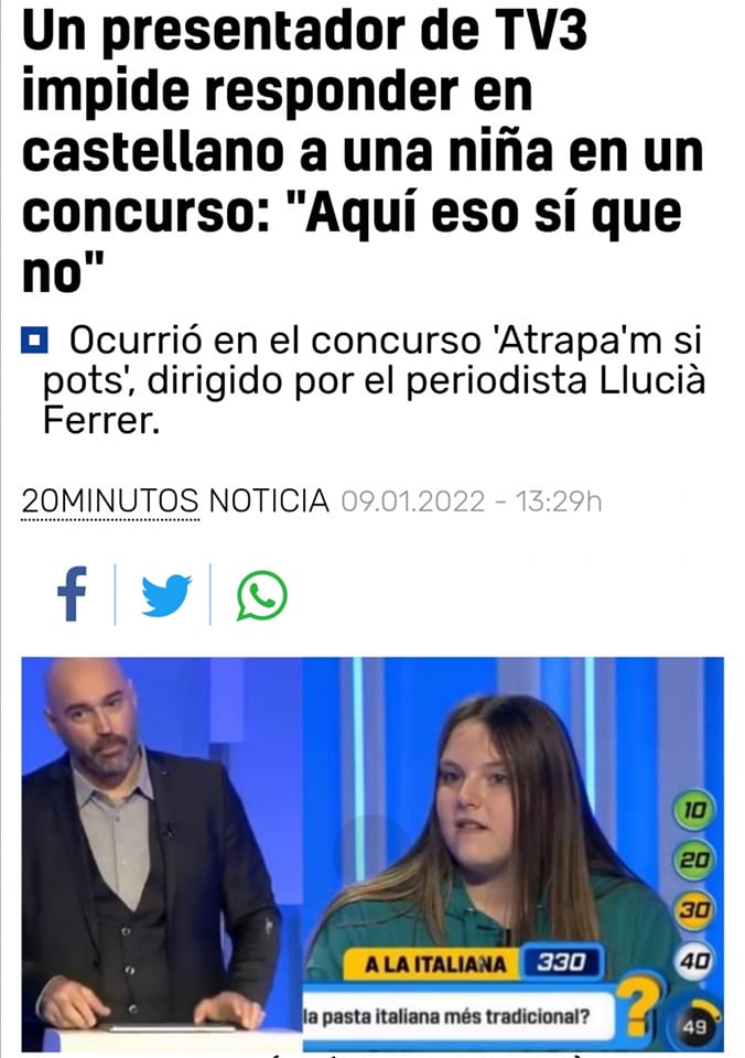10/01/2022.- TÚpatria rechaza el sectarismo de TV3 en un programa de concurso para niños😡 impidiendo a una niña responder en español (¡NO! Aquí esto sí que no)😡 Además, queda demostrado que la inmersión lingüística es un auténtico fracaso👎 Se recuerda a los separatistas el artículo 3.1 de la Constitución (les guste o no): "El castellano es la lengua española oficial del Estado. Todos los españoles tienen el deber de conocerla y el derecho a usarla." #CierreTV3 #StopSectarismo https://www.20minutos.es/noticia/4938040/0/puedo-decir-castellano-polemica-reaccion-presentador-tv3-concurso-infantil/?fbclid=IwAR325KzJ6LyNYHmlsinK4WlysrmjfhsZuosn4Q0Kwf8PEdvR2oO6WcMIH0s