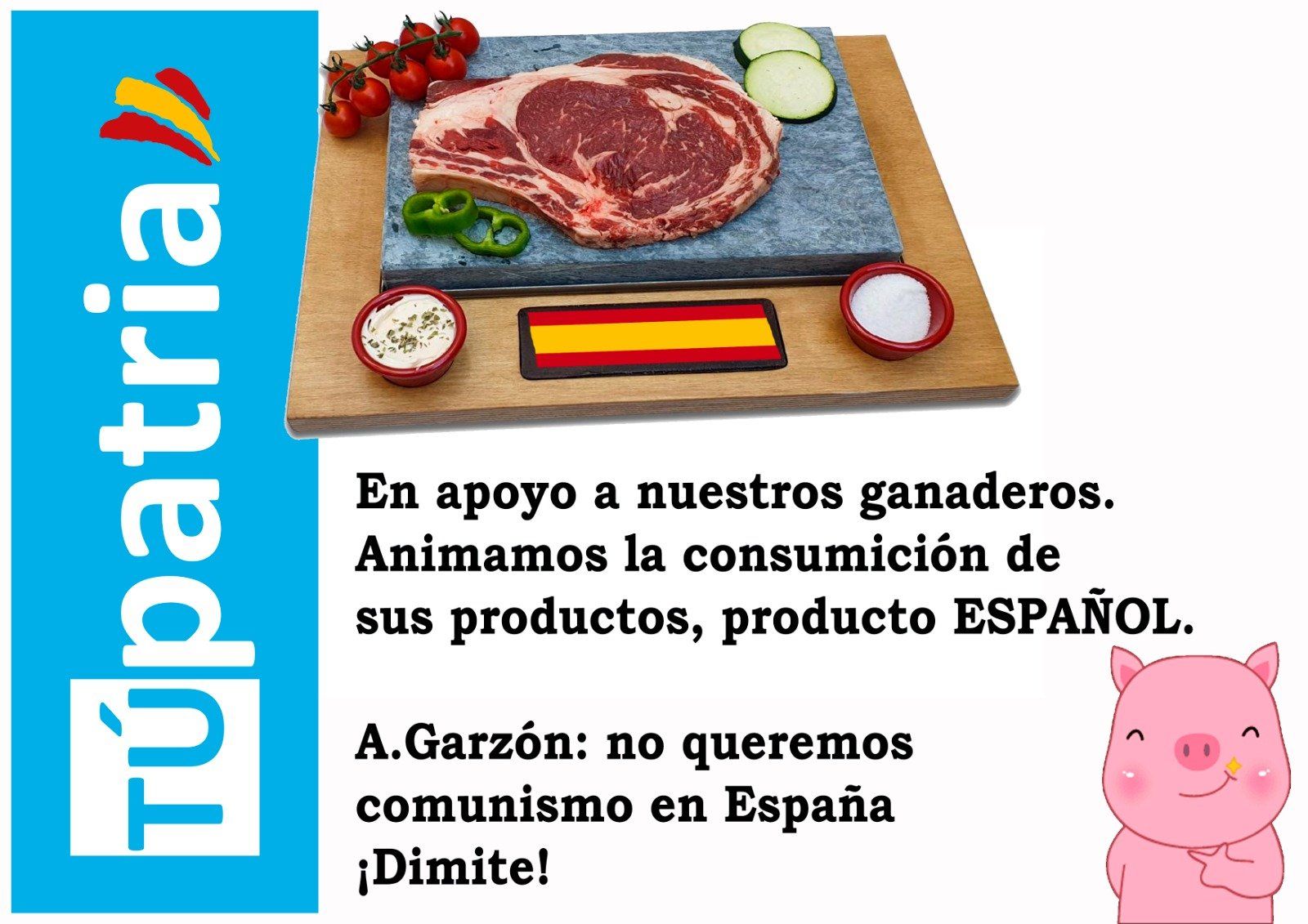 07/01/2022.- En relación a la entrevista realizada al Ministro de Consumo, Alberto Garzón, en el medio “The Guardian” donde afirmó, según el periódico, “España exporta carne de mala calidad", "contaminan el suelo, contaminan el agua y luego exportan esta carne de mala calidad de estos animales maltratados", TÚpatria quiere expresarse sobre tales afirmaciones: • Estas intolerables declaraciones son una clara agresión hacia el sector primario español, afectan a nuestra economía, empleo y tejido productivo. Por tanto, TÚpatria exige su dimisión o cese inmediato por parte de este gobierno socialcomunista, por mentir y faltar al respecto a nuestros ganaderos y a la carne que producen en España. • Además, por mucho que haya intentado rectificar diciendo que “tenemos que cambiar nuestros hábitos y comer menos carne”, también coarta la libertad de las personas; estas afirmaciones son inaceptables. Tales afirmaciones son propias de las dictaduras comunistas. Por mucho que quiera instaurar su modelo calamitoso comunista (Cuba, Venezuela, etc.) TÚpatria estará luchando por la libertad de las personas, a favor del sector primario y del consumo de los productos que se fabrican en España, ya que son de primera de calidad. CONTACTO PRENSA [email protected] 621-279-331