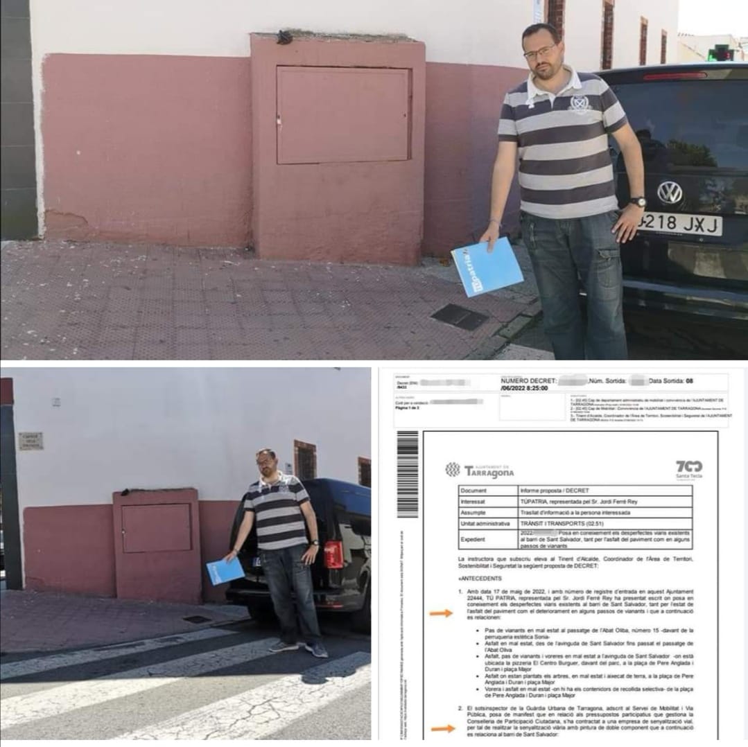 Tarragona. 09/06/2022.- TÚpatria en Tarragona se congratula que el Ayuntamiento tarraconense haya accedido a la petición del partido para la mejora de los desperfectos detectados en el barrio de Sant Salvador de Tarragona (asfalto del pavimento y deterioro en algunos pasos de peatones) debido al mal estado en que se encontraban, ya que los peatones sufrían el riesgo de caerse y lesionarse, o bien se podía producir algún accidente vial entre peatones y automóviles. El extracto de la resolución ha sido el siguiente: «ANTECEDENTES 1. Con fecha 17 de mayo de 2022, y con número de registro de entrada en este Ayuntamiento XXXX, TÚ PATRIA , representada por el Sr. Jordi Ferré Rey ha presentado escrito donde pone en conocimiento los desperfectos viarios existentes al barrio de San Salvador, tanto por el estado del asfalto del pavimento como el deterioro en algunos pasos de peatones… 2. …se ha contratado a una empresa de señalización vial, para realizar la señalización viaria con pintura de doble componiendo que a continuación se relaciona en el barrio de San Salvador: • Avenida de San Salvador, tramo comprendido entre la calle de Àngel Guimerà y la avenida • Pirineos: pintura de 8 pasos de peatones • Avenida de San Salvador, un beso y adiós + estacionamiento de motos • Avenida de San Salvador, zona central y repintar separación de carriles • Rotonda y otros elementos en la calle de acceso a San Salvador Para el presidente provincial, Jordi Ferré, considera que “TÚpatria está realizando una gran labor basándose en su filosofía municipalista para solucionar los problemas diarios de nuestros vecinos. Seguiremos trabajando duro para que el proyecto celeste llegue a cada uno de los habitantes de nuestros municipios” CONTACTO PRENSA