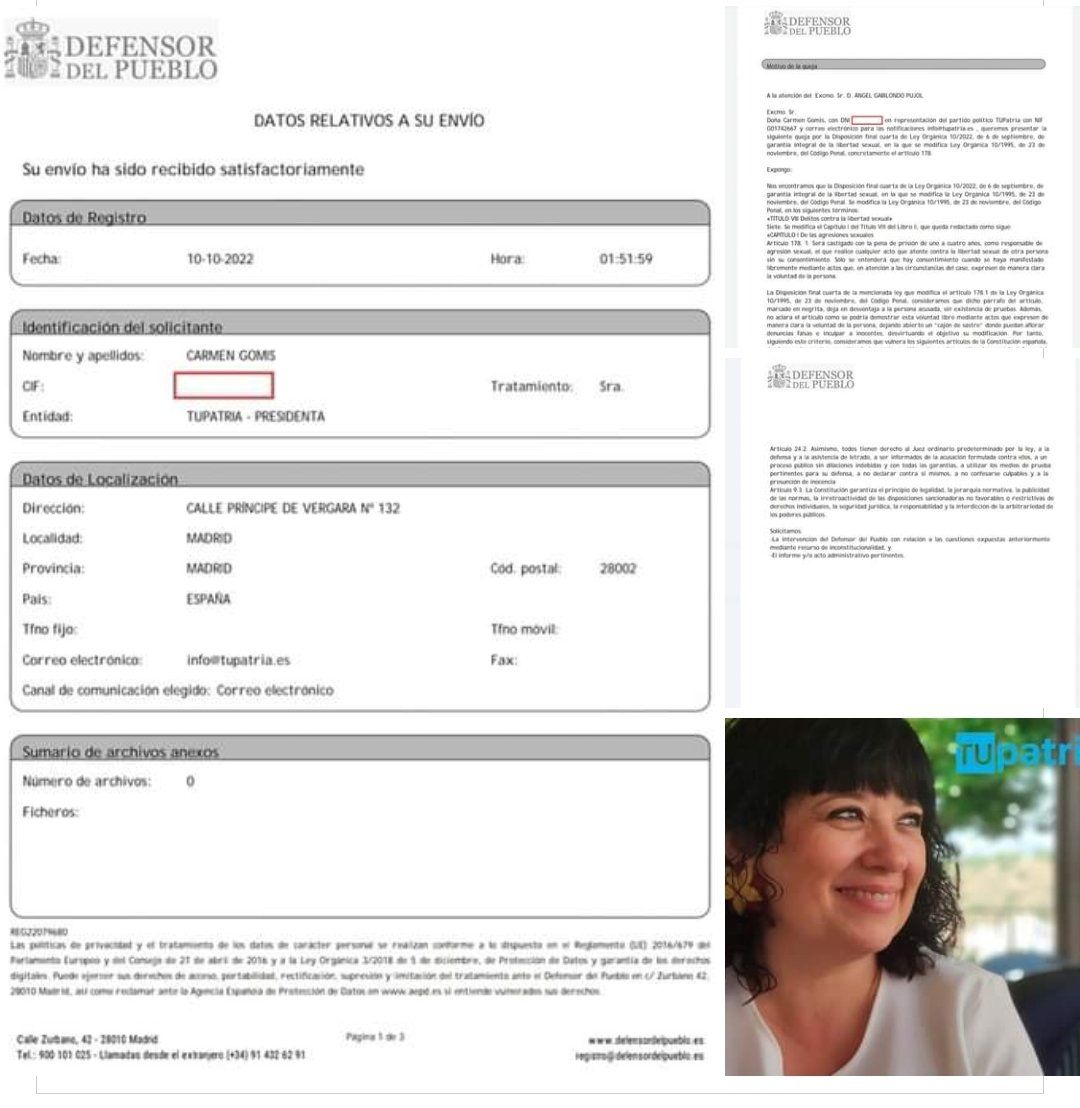 Madrid. 10/10/2022.- La presidenta nacional de T Upatria, Carmen Gomis, ha registrado una queja en nombre del partido ante el Defensor del Pueblo, por la reciente entrada en vigor de Ley Orgánica 10/2022, de 6 de septiembre, de garantía integral de la libertad sexual, o conocida como “Ley Irene Montero” donde lesiona (aún más) el derecho a la presunción de inocencia. Para Carmen Gomis “Hemos registrado esta queja ante el Defensor del pueblo pidiendo que presente un Recurso de inconstitucionalidad ante el Tribunal Constitucional, ya que el artículo deja en clara desventaja a la persona acusada, sin existencia de pruebas. Además, no aclara como se podría demostrar esta voluntad libre, mediante actos, que expresen de manera clara la voluntad de la persona, dejando abierto un “cajón de sastre” donde puedan aflorar denuncias falsas e inculpar a inocentes. Por tanto, consideramos que vulnera los artículos 24.2 y 9.3 de la Constitución española, donde se vulneran claramente: -La presunción de inocencia -A utilizar los medios pertinentes para la defensa del sujeto -El principio de la seguridad jurídica. Por tanto, estas son leyes ideológicas socialcomunistas que nos pretenden separar, que pretenden la pelea entre ambos sexos. En definitiva, son meras cortinas de humo porque este gobierno está gestionando de forma nefasta nuestro país: tenemos una inflación desbocada, nos aumentan los impuestos, aumenta el coste de la vida, se nos avecina una crisis económica, crean dependencia energética con el exterior que encarece la factura de los suministros de las familias